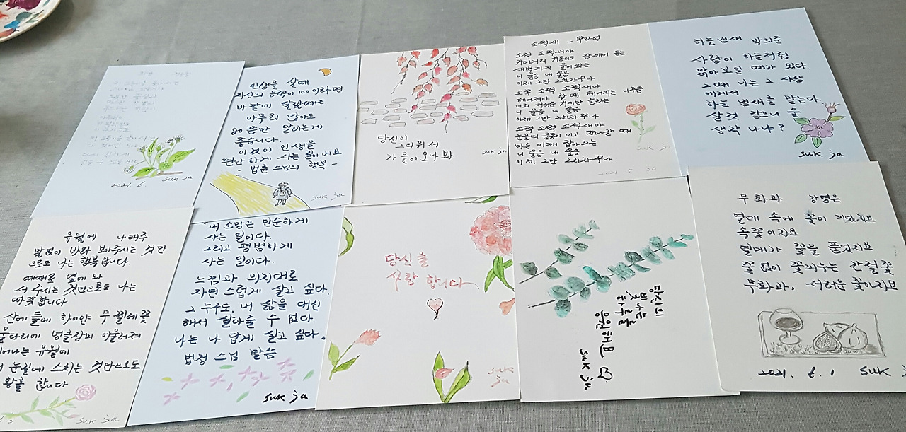 내가 할 수 있는 것은 집에서 열심히 엽서에 시를 쓰고 그림을 그려 집행하는 선생님에게 전달한다. 봉사란 혼자서 하는 일이 아니다. 한 번에 필요한 엽서는 200장도 필요하고 두 번째는 300장 정도 되니 엄청난 숫자다. 어떤 집은 가족들 전체 아들 딸들도 함께 한다. 아직 세상을 잘 모르는 아이들도 좋은 일을 하고 봉사를 한다는 마음에 흐뭇할 것 같다. 사람 사는 일이 아직은 따뜻하고 정을 나누는 일이 있다는 걸 배울 것 같다.