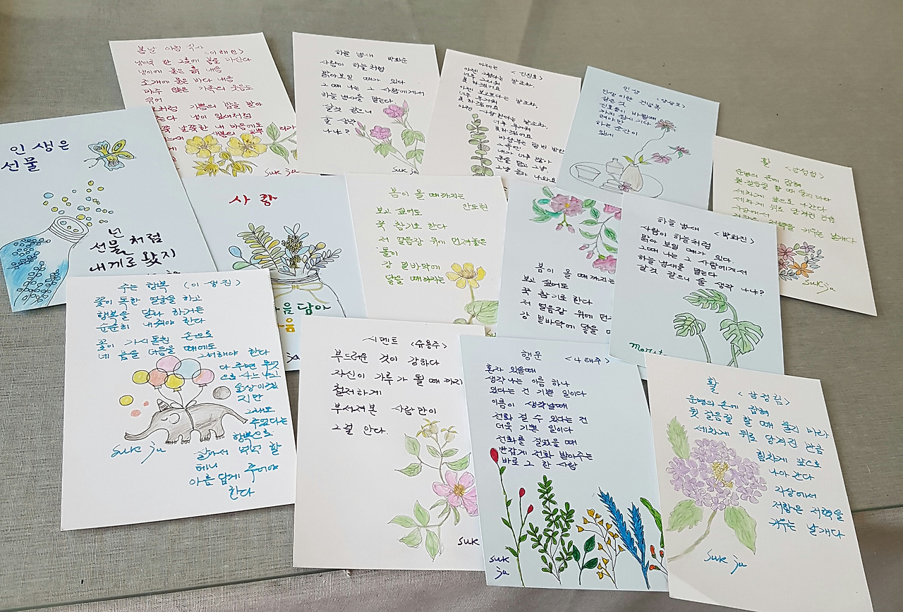 엽서에 시를 필사하고 그림을 그린다