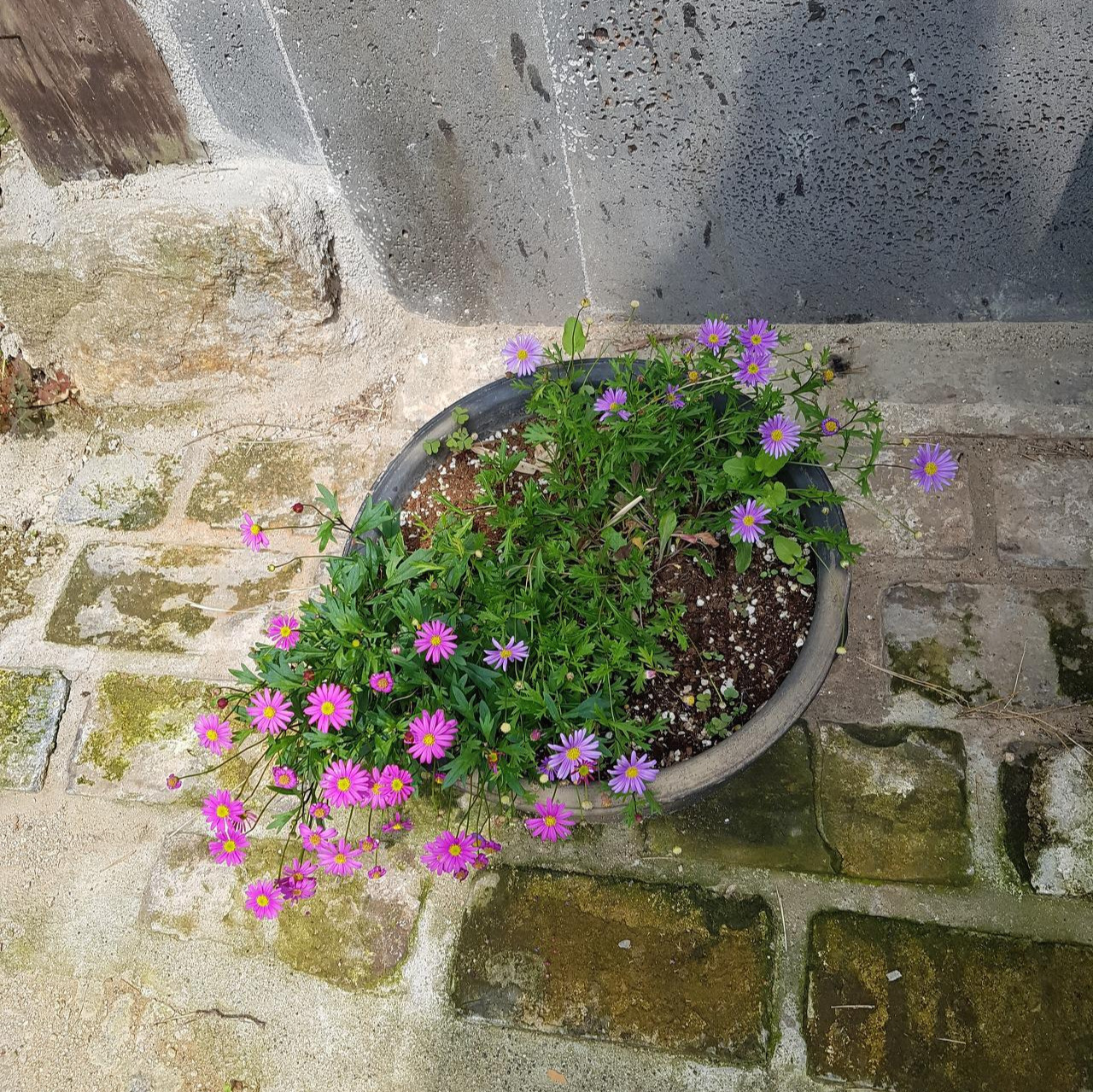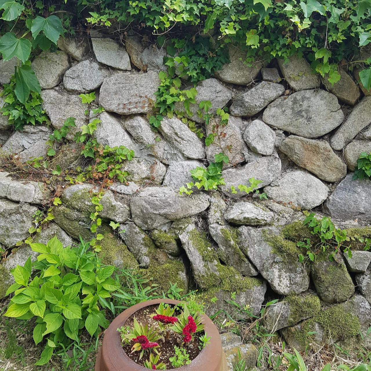 탐스럽지 않지만 오지 자배기에 피어 있는 꽃이 정겹다 돌담과 옛날 쓰던 솥에 맨드라미