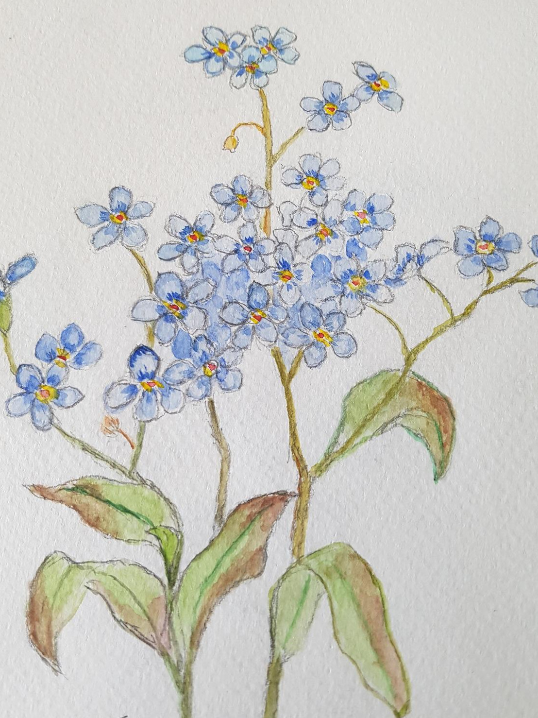 여름이라서 시원해 보이는 물망초를 그렸다. 물망 초하면은 꽃말이 나를 잊지 마세요, 진실한 사랑이다. 물망초를 보면 pale blue라는 애틋한 색이 떠오른다. 사랑하는 이에게 꽃을 바치려 했다가 죽음을 맞이한 어느 청년의 영혼이 담긴 꽃이기도 하다. 고산 식물이라 키가 작은 것들이 많고 바위틈 같은 곳애서 자란다.