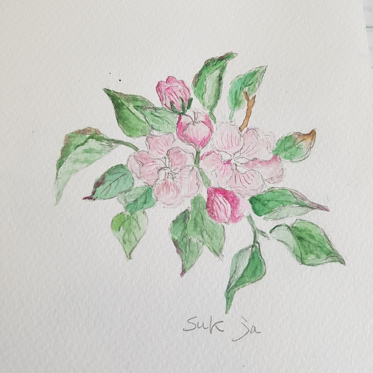사과 꽃은 배 꽃이 필 때면 거의 같은 시기에 피는 꽃이다. 차를 타고 지나갈 때 과수원에 피어 있는 꽃을 보면은 환상적이다. 그러나 사과꽃이 필 때면 가 까이 가 본 적이 없어 꽃을 세밀하게 관찰해 보지는 못했던 것 같다. 그림을 그리면서 사과꽃과 만나고 꽃의 아름다움을 새삼 느끼게 된다.