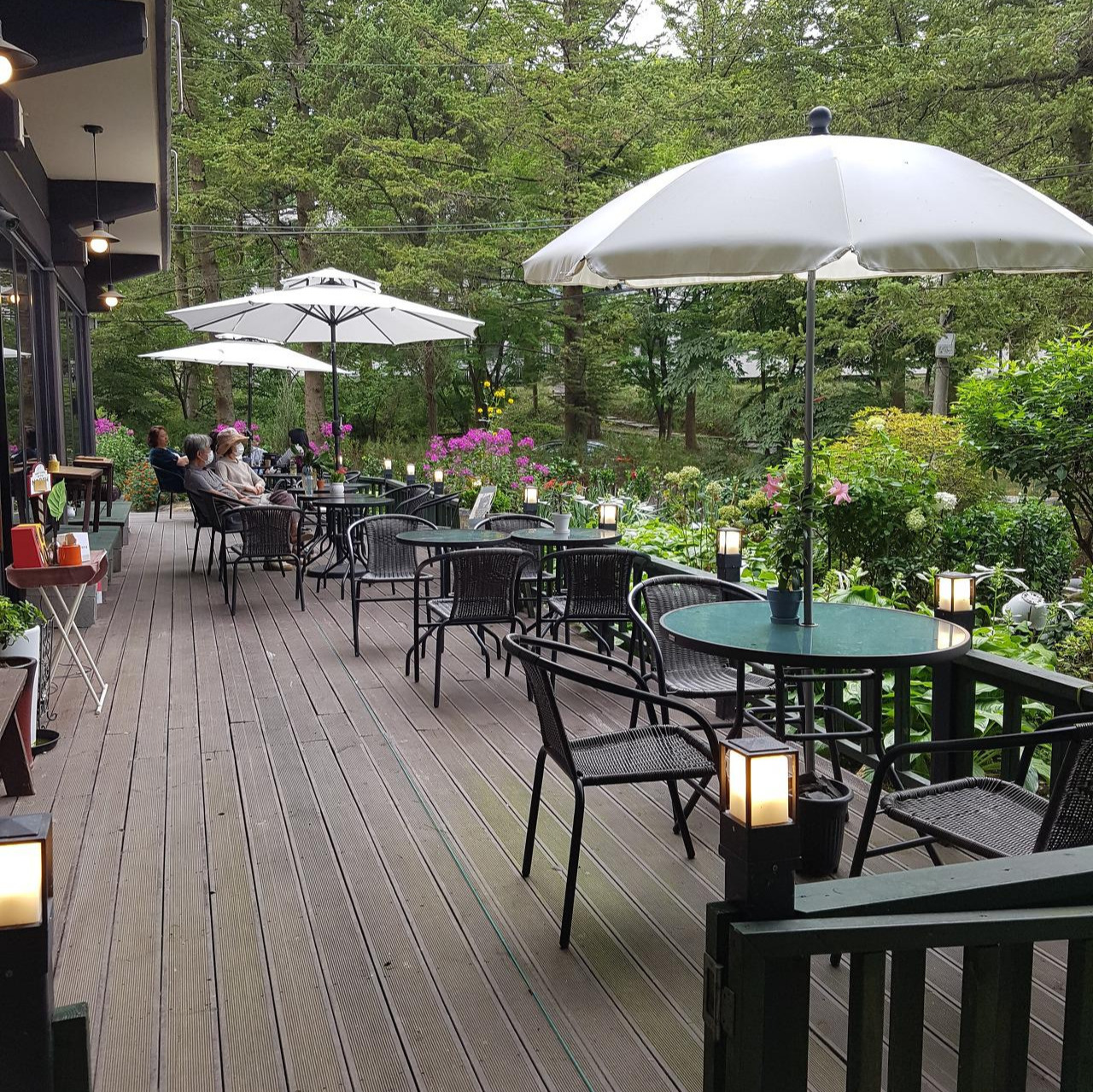 사람이 많으니 마음이 불편하다. 우리는 걸어서 사람이 많지 않은 곳을 찾았다. 한참은 걸으니 조용하고 꽃이 많이 핀 예쁜 카페가 나온다. 데크가 있는 카페로 들어갔다. 카페가 텅텅 비어 우리 차지다. 손자는 좋아하는 것을 찾아 뛰어다니고 셋째 사위는 사진 찍기 바쁘다. 우리는 데크가 있는 의자에 앉아 조용히 마음을 쉰다. 산아래 카페는 옆에 꽃밭에는 꽃들이 예쁘다.