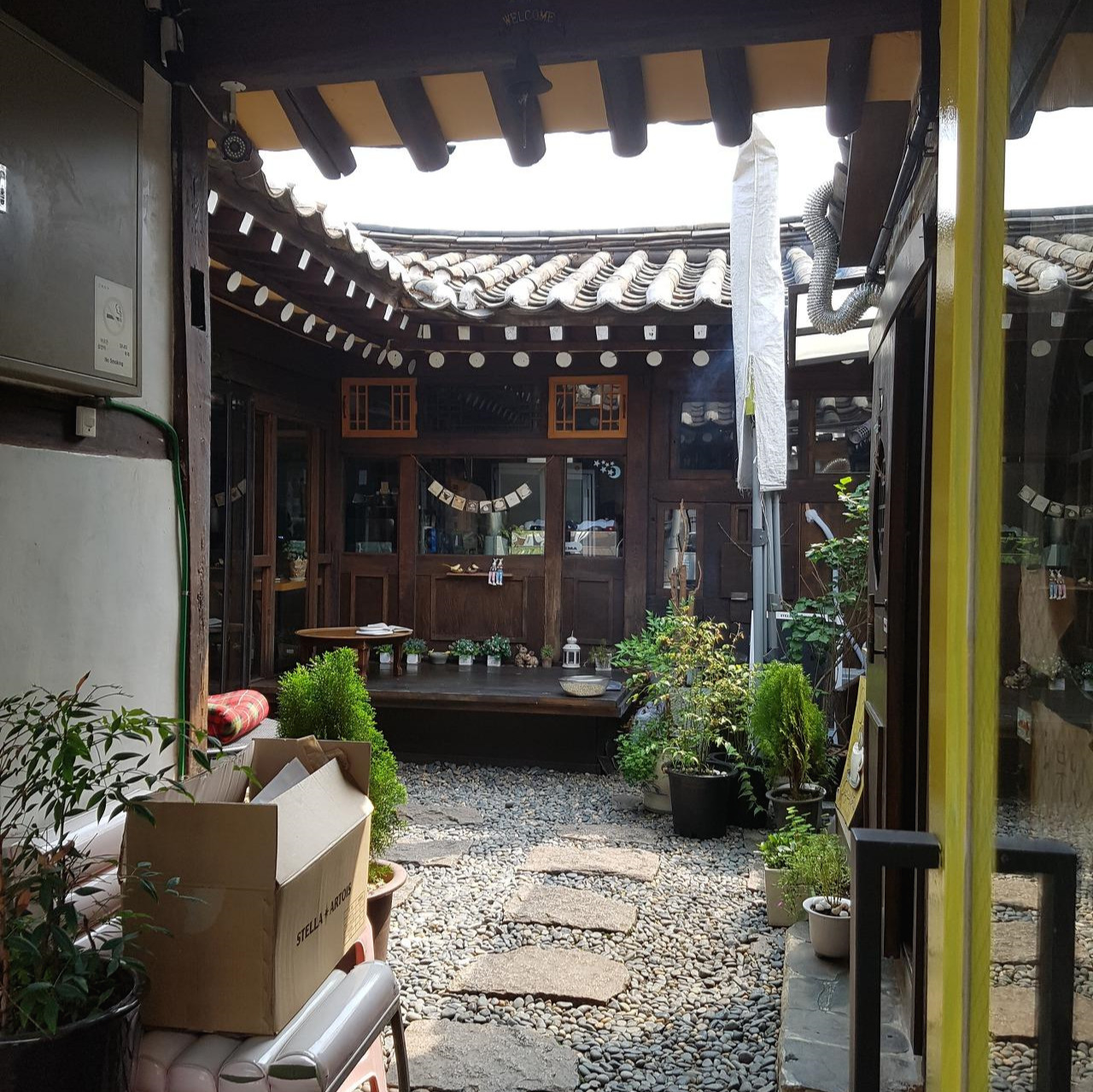 젊은 사람들 감각으로 오 밀 조밀 꾸며 놓아 너무 예쁘고 정겹다. 한옥의 멋을 그대로 살려 담만 살짝 허물고 인테리어를 멋스럽게 해 놓았다. 시멘트 담장을 절반 정도 허물어 벽에 화분을 올려놓는 센스도 멋지다. 어떤 집은 마당을 실내로 만들고 가운데 네모난 공간은 워터 코인을 심어 놓았는데 시원스럽고 운치가 있다. 참 요즈음 젊은이들 감각과 아이디어가 기발하다.