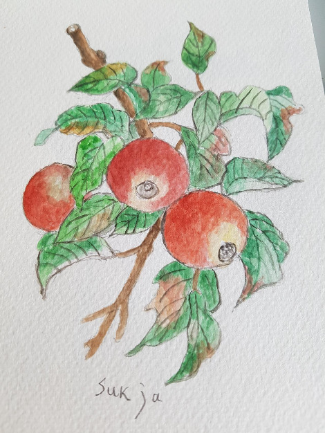 나는 개인적으로 제일 선호하는 과일이 사과다. 사과는 맛도 있지만 보는 것만으로도 사랑스럽다. 지난 일 년 시니어 클럽을 다니면서 그림을 그렸다. 그림이라고 말하면 엄청난 것 같지만 사실은 거의 작은 꽃그림과 그리고 과일 그림을 그렸다. 사무실에서 두 번 그림 연습을 하고, 한주는 군산에 관광 오시는 분 들이 필요하면 가져 가도록 그린 그림인데 사람들은 남의 그림에 별 관심을 같지 않는다.