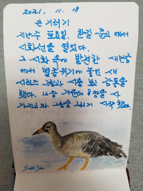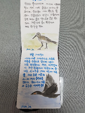 김지연 작가님을 만나고 환대하는 마음에 대해 공감하면서 닮을 수 있도록 노력해야겠다고 생각하는 계기가 되었다. 사람이 환대를 받는 것처럼 기분 좋은 일은 없다. 나의 존재감을 살려주는 일이다. 작가님은 모두에게 환대를 하면서 사랑을 나눠 주시는 밝고 명랑한 기운을 가지신 분이다. 처음 그려보는 그림이지만 그림을 그리고 일기를 쓰는 시간은 나에게 위로였다. 글을 쓰는 행위나 그림을 그리고 일기를 쓰는 일이 곧바로 나와의 만남이 되면서 삶에 대한 통찰에 생각이 많아졌다.