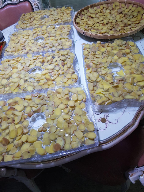 생강을 껍질을 벗긴 후 썰고 솥에다 찜기를 놓고 생강을 적당히 익을 만큼 10분 정도 쪘다. 찐 생강은 건조기에 넣어 밤새 10시간이 넘게 말렸더니 거짓말처럼 양이 줄었다. 딸이 먹을 생각에 기분부터 좋아진다.