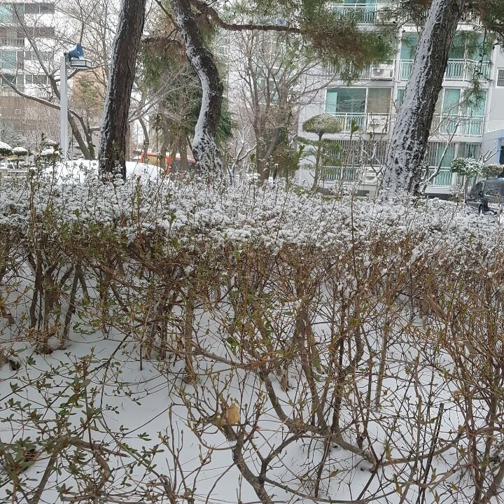 " 여보 일어나 봐, 눈이 많이 와서 예뻐" 일찍 잠이 깬 남편이 부른다. 나이 든 어른들이 눈을 처음 본 사람처럼 호들갑이니 참 우습다. 사람 마음은 왔다 갔다 하나 보다. 사물은 멀리서 바라보면 아름다워 보이고 가까이 보면 시들하다 했던가, 눈이 많이 올 때는 그냥 오나 보다 했는데 겨우내 눈을 못 보고 넘어가려나 생각하다가 포근하게 내린 눈을 보니 반갑다.