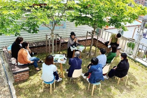 오월의 하늘과 햇살이 곱다. 책방 아래 작은 정원에는 팽나무 두 그루의 그늘이 있다. 사람들이 앉아 담소하기 좋은 공간이다. 책방 안에 있는 의자를 가지고 나와 야외 정원에서 정담을 나누는 시간은 모두가 자기를 돌아보는 조용한 시간이 된다. 탁자 위에 놓인 어제 찐 아카시아 꽃떡을 먹으며 차도 마신다.