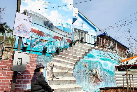 말랭이 마을 봄날의 책방이 보이는 곳남편은 말랭이 마을 주차장에 나를 내려놓고 휑하니 가버리신다. '봄날의 책방'에 올라가는 길에는 나무들의 푸른 녹음이 시원스럽다. 주차장에서 몇 걸음 걷지 않았는데도 숨이 차 오른다. 예전 사람들은 얼마나 많은 세월을 무거운 짐을 지고 오르면서 살았을까. 많이 힘들었을 것 같다.