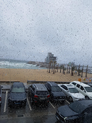 비가 오고 바람이 세차게 불고 있는 안목 해변