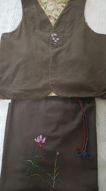 광목에 천연 염색을 하고 수를 놓았다. 위 옷은 손 바느 질 조끼