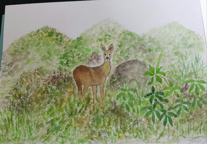 파랑 나비 작가님은 내가 살고 있는 곳에서 멀지 않은 곳에 사시는 분이다. 우연히 군산 말랭이 마을 책방에서 만나 알게 되었다. 얼마나 사근 사 근 한 지 사람을 기분 좋게 하는 친절이 몸에 베인 분이었다. 고라니 사진이 있는 글을 보고 "고라니를 그려 볼까 해요?" 물어보니 "그래요?" 하는 긍정 신호를 듣고 그림을 그렸다.