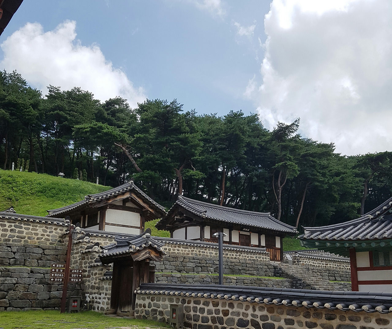 문헌 서원은 큰길에서 이정표를 따라 시골길로 한참을 들어가니 문헌 서원 이란 곳이 나온다. 차를 주차하고 내리니 맨 먼저 마주하는 널따란 잔디가 눈이 시원해진다. 사람도 거의 보이지 않고 푸른 잔디만 바라보아도 마음이 평온하다. 널따란 잔디와 기와집들 풍경이 너무 멋져 정말 한 폭의 그림 같다.