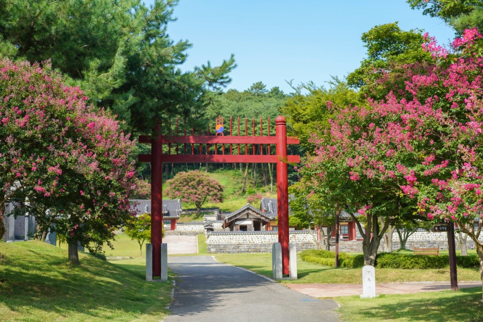 <문헌 서원은 고려말 대학자 가정 이곡과 목은 이색의 학문. 덕행을 추모하기 위해 세운 서원으로 광해군 3년에 나라에서 문헌이라는 헌 판을 받아 사액된 것이다. 이곳은 자연과 함께 아름다운 경관 명소로 유명하며 특히 이색 선생 영당 뒤 아름다리 배롱나무가 장관이다. 배롱나무꽃은 8월~9월 사이에 만개하며, 우리 전통건축과 선홍 빛 꽃이 어우러진 자연미를 감상할 수 있다.> 팸플릿에서