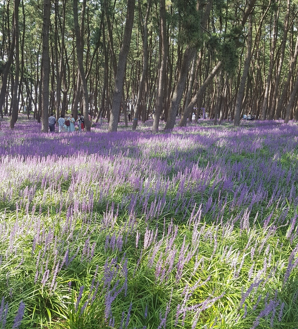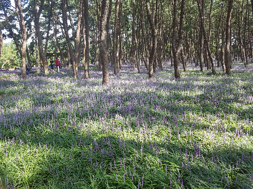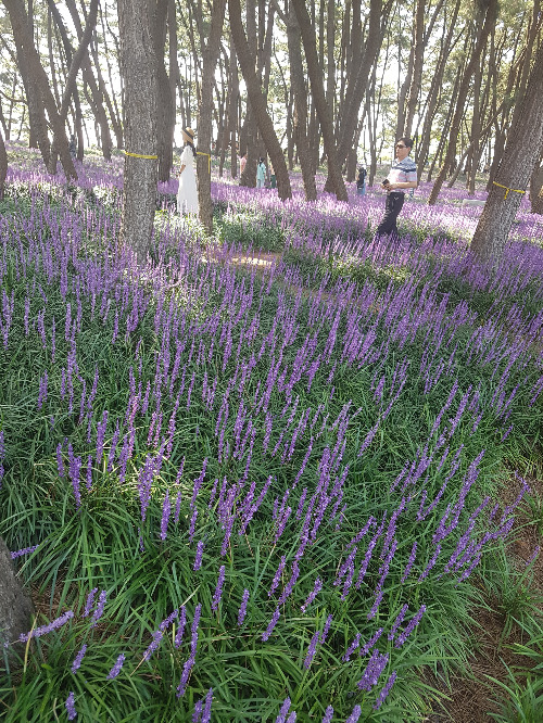 말을 조금 더해서 정말 전국 차가 다 모였나 할 정도로 차가 많았다. 주차를 하기 위해 한참을 헤매다가 겨우 한 곳에 주차를 하고 몇 걸음 걸어오다가 송림 사이 맥문동 꽃을 보고서 탄성이 절로 나왔다. 사람들이 오늘 이곳에 모며든 이유를 알 것 같다. 정말 어느 곳에서 소식을 듣고 왔는지 꽃물결 사람 물결이다.