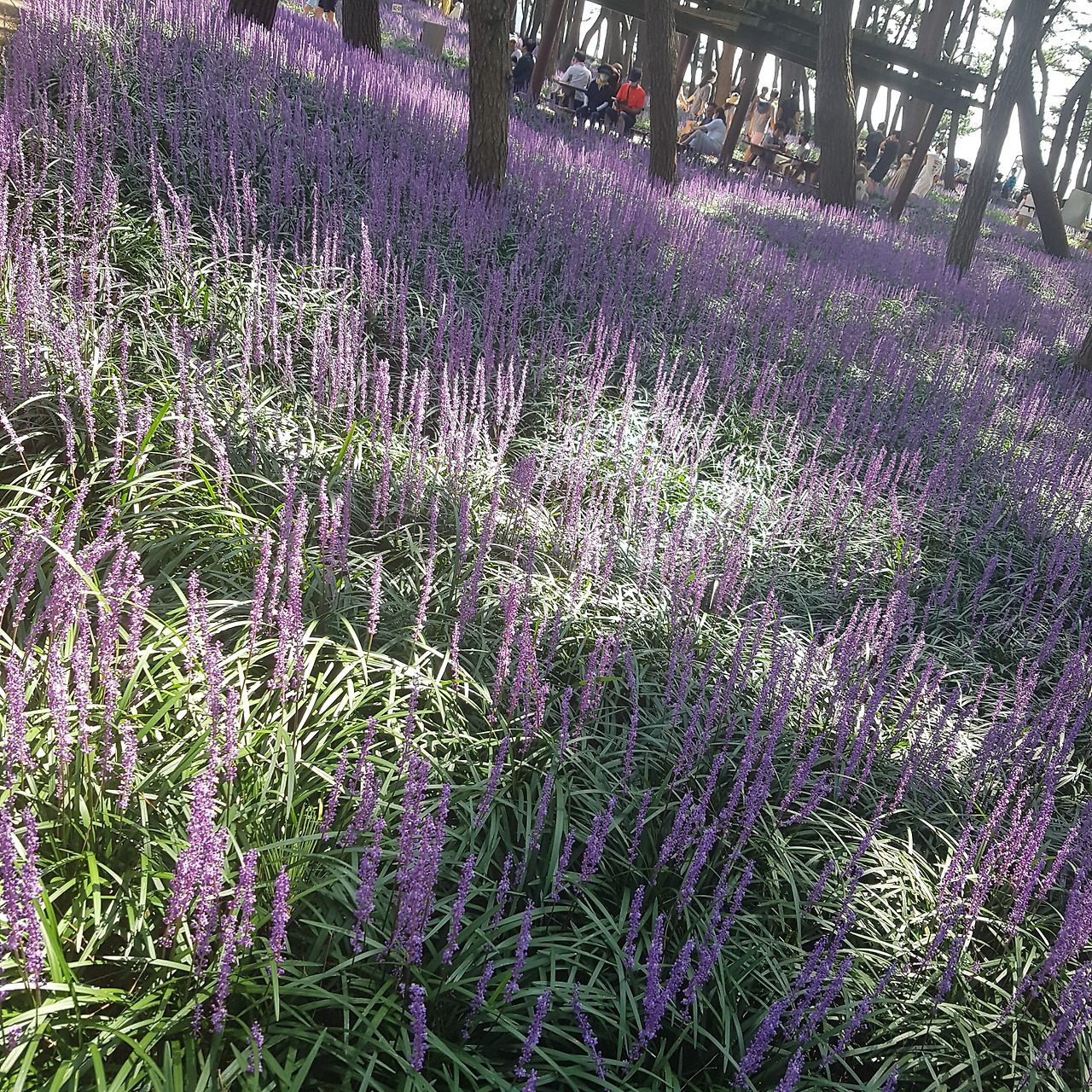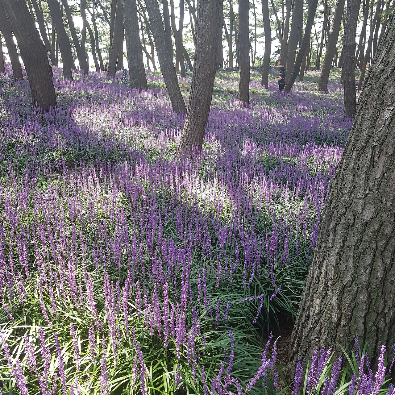 보면 볼수록 보라색이 귀하고 멋지다. 코로나로 울적했던 마음이 맥문동 꽃을 보며 위로받는다. 인위적으로 만들어 놓은 것이 이처럼 예쁠 수 있을까. 자연이 주는 아름다움이 경이롭다. 바닷가에 기상도 의연한 모습으로 해송이 품고 있는 맥문동 꽃이 얼마나 아름다운지 신비롭기까지 하다. 어느 누가 그림을 그려도 이처럼 아름답게 그릴 수 있을까 싶은 생각이 든다.