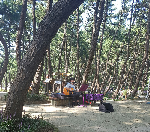 나이 젊은 분들은 의자에 앉아 노래를 들으며 박수를 치고, 맥문동 보랏빛 꽃을 보며 축제를 한다. 주선하는 사람도 없다. 모두가 자율적으로 노래를 하고 듣고 자연스럽게 이루어지는 일이다. 노래를 듣고 일어날 때는 앞에 놓여 있는 곳에 작은 성의를 보이며 얼마 정도 돈을 넣고 일어나는 사람들 모습도 참 보기 좋다.