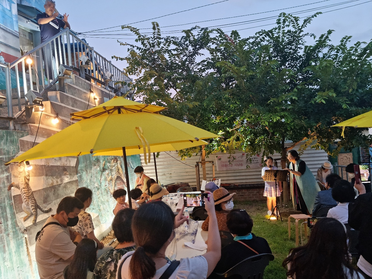 가을이 오는 길목 시 한 편을 낭송하며 추억을 남긴다. 남편과 동생이 함께 해 주고 익산에서 오신 파랑 나비 작가님까지 응원해 주어 내게는 더 빛나는 밤이 되었다. 사람은 역시 어울려 살아햐 한다. 많은 사람의 시가 가슴을 촉촉이 적셔 준다. 시를 낭송하고 지역주민과 시를 좋아하는 사람들과 멋진 하루를 보내고 추억을 쌓는다.