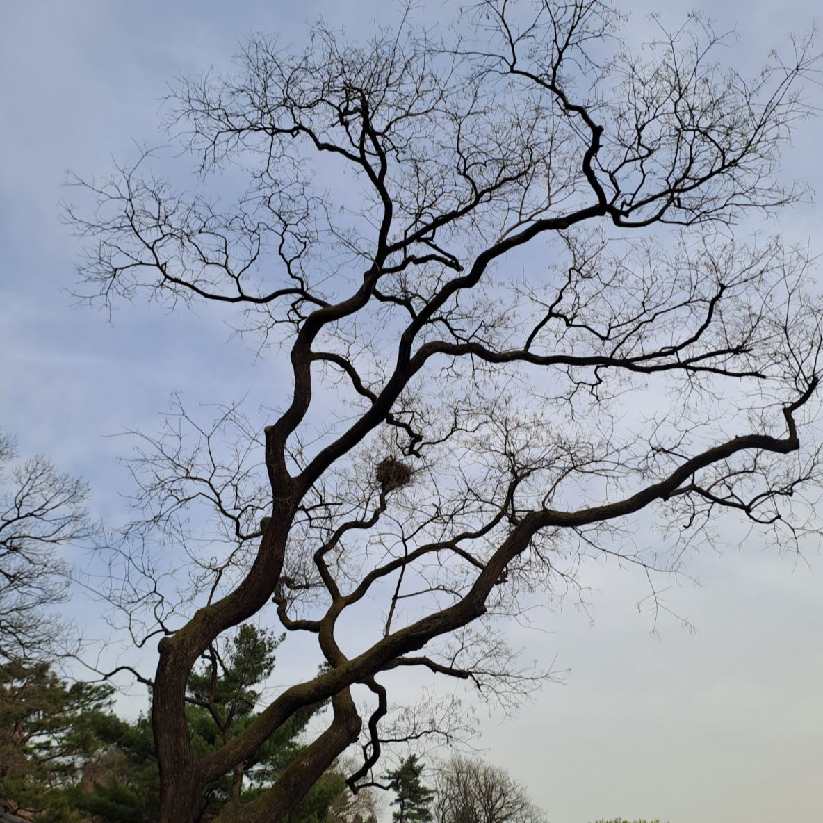 산책로에는 쉬어 갈 수 있는 초가지붕정자도 있고 산 위에서 내려오는 물도 있어 물소리를 듣고 앉아있으면 마음 안으로 불어오는 바람은 청량하다. 많은 잡념을 씻어 낼 수 있을 것만 같은 느낌이다. 그 또한 즐거움 중 하나다. 길을 걷다 만나 특이한 나무를 바라보고 사진을 찍었다. 새들의 보금자리 둥지가 있는 나무가 마치 한 폭의 그림 같다.