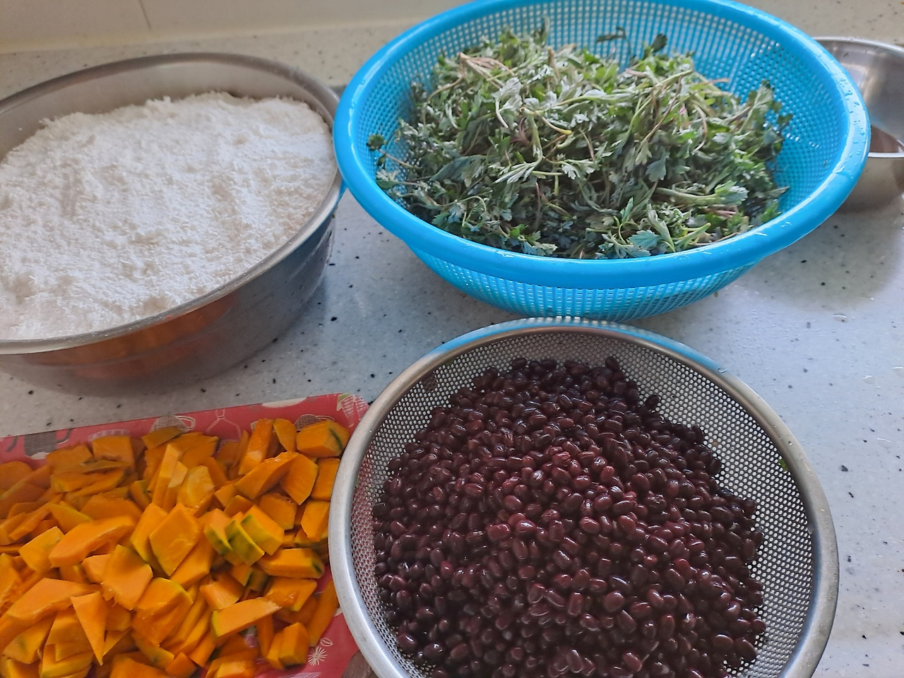 6 씻어 놓은 쑥과 쌀가루. 삶아 놓은 팥도 넣고 호박도 함께 섞어