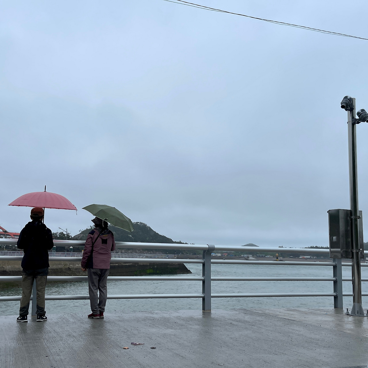 비 오는 바닷가 남편과 나는 저 멀리 수평선을 바라보고 있다