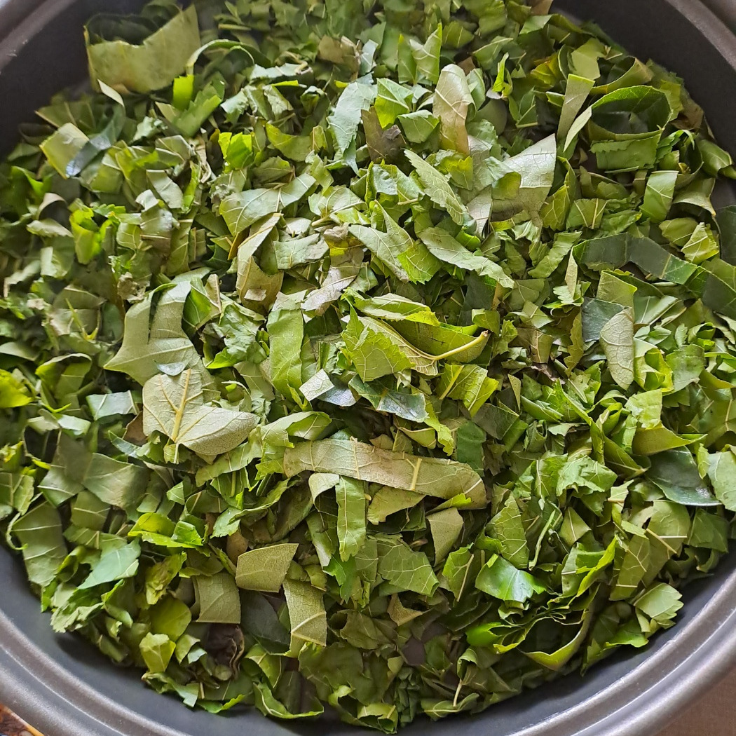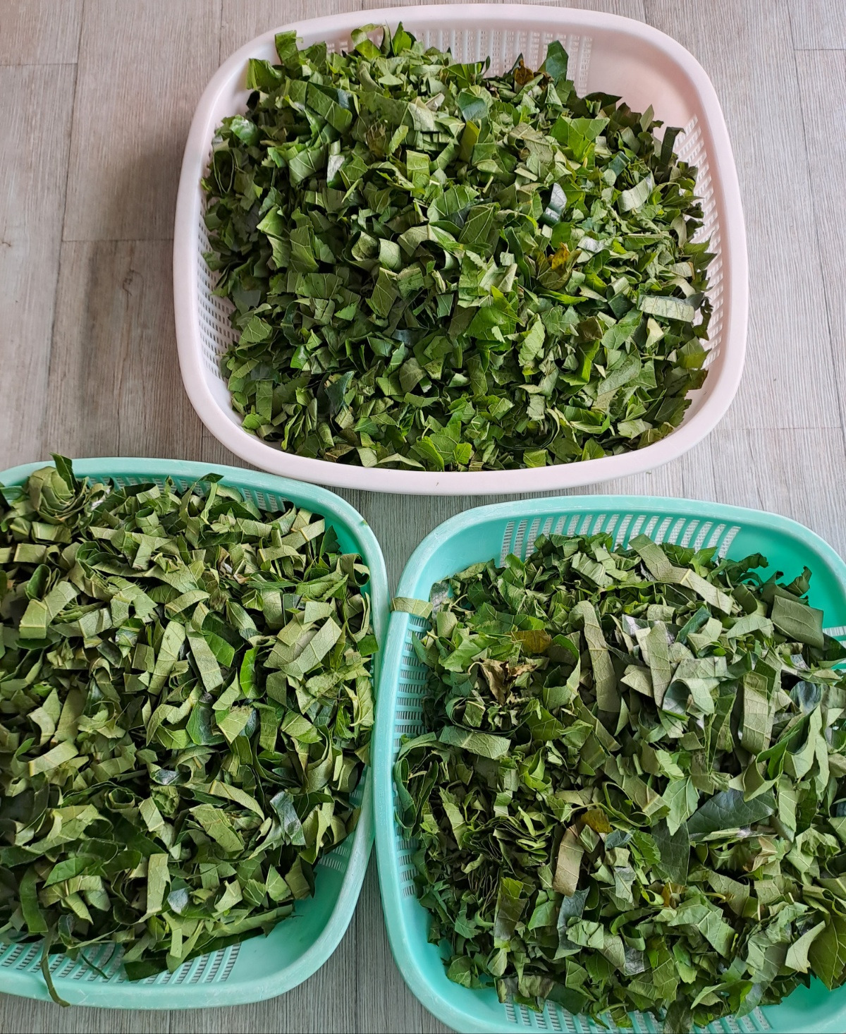 4 물기가 말른 뽕잎은 한잎 두잎 포개여 잎 꼭지와 잎을 잘게 가위로 자른다.