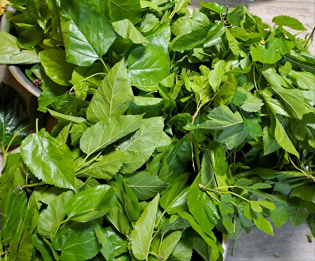 1 뽕잎은 집으로 가지고 와서 나뭇잎과 잔가지 같은 것을 분류해서 다듬어 놓는다.
