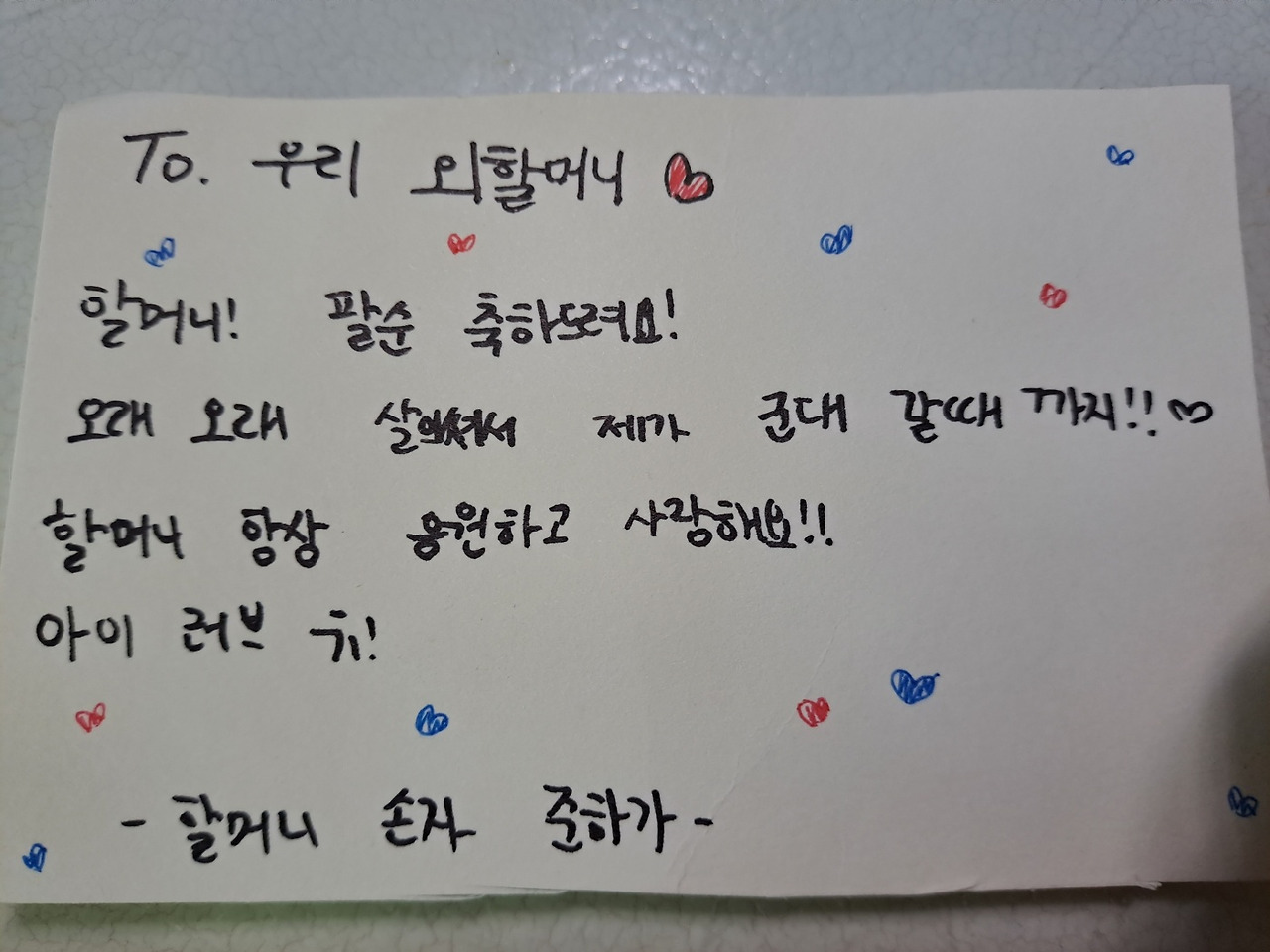 아직은 초등학생인 막내 손자가 손 편지 카드와 립스틱 선물을 건네준다. 그걸 읽으며