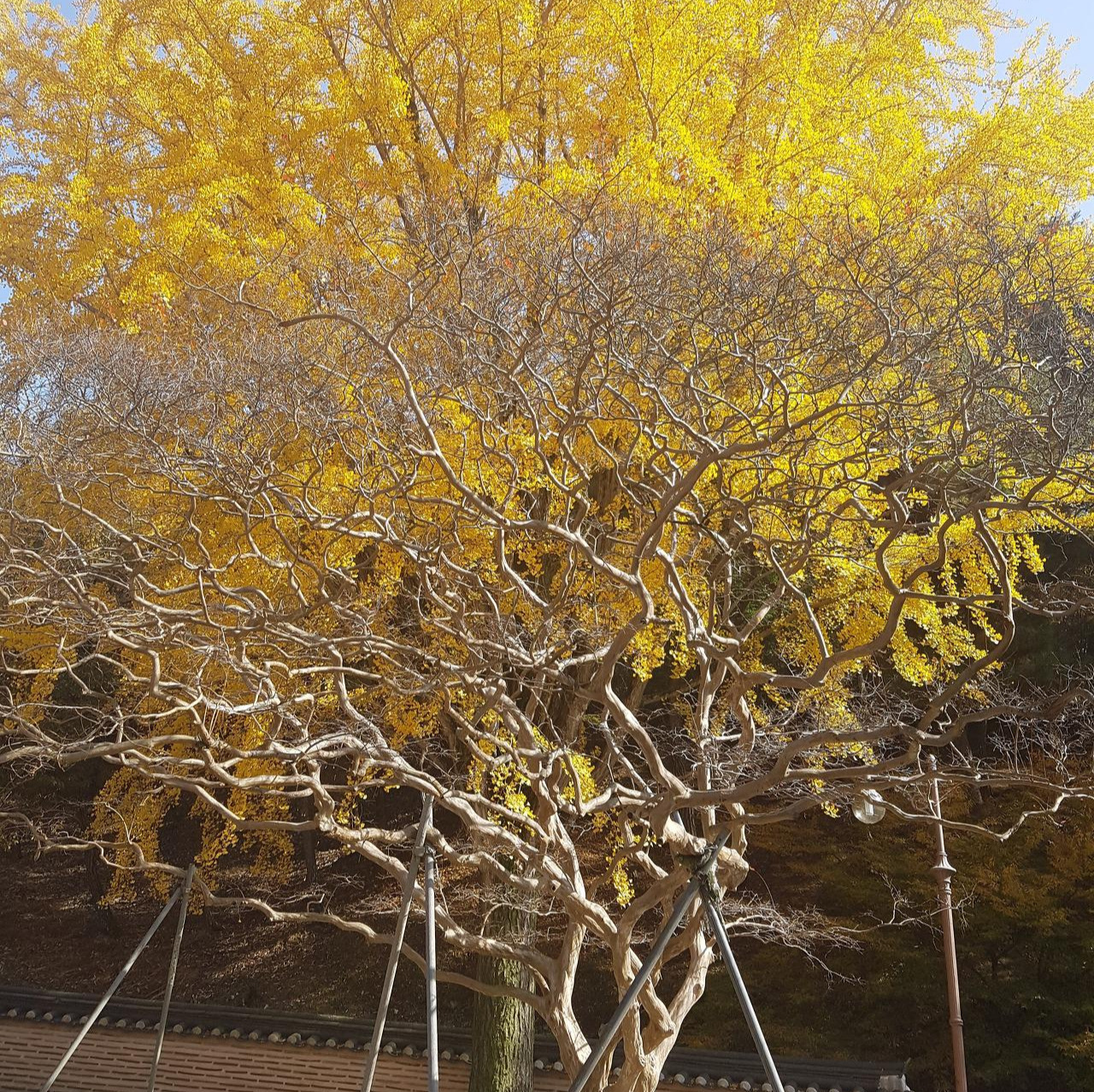 숭림사는 군산에서 30분 정도면 도착을 하는 가까운 거리다. 숭림사 입구에서부터 가을의 쓸쓸한 느낌이 전해진다. 정말 사람의 그림자는 하나도 보이지 않고 길은 한적하다. 낙엽이 진 나목만이 말없이 서 있다. 군데군데 남아 있는 단풍 진 나뭇잎 몇 잎만 남아 바람에 나부끼는 모습도 가을의 운치를 더해 준다. 절 마당 들어서기 전 담장 안으로 보이는 은행나무를 보고 모두가 탄성을 지르며 놀라워한다. 노란 은행잎이 그대로 남아 있는 은행나무는 말 그대로 환상이다. 노란 은행잎이 이처럼 아름답게 느낀 지 오래되었다. 신은 어쩌면 이리도 아름다운 색의 자연을 인간에게 선물해 주실까, 노란색이 이처럼 예쁘다니, 감탄사가 절로 나오고 말이 없어진다.