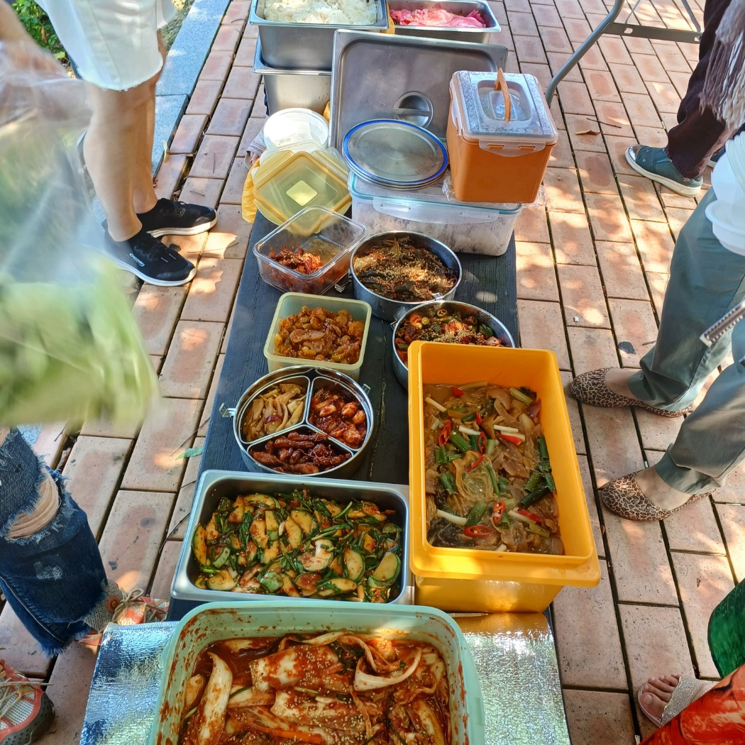 밥도 몇 솥을 했고 더운 날 반찬도 많이도 준비하셨다. 다른 분들은 보리밥에 열무김치, 배추 겉절이, 나는 언제나 정해 놓은 듯 묵은 김치찜을 한다. 나이 들면 누구나 좋아하는 묵은지 찜은 만드는 게 특별하지 않지만 김치 찜은 우리 입맛에 딱 맞는다. 모두가 좋아하는 묵은지 김치찜, 이건 워 정말 특허라도 내야 할지, 언제부터 나는 사람이 모여 밥을 먹는 곳이면 김치찜을 해 나르고 좋아하고 맛있게 먹는 모습을 즐기며 뿌듯하다.