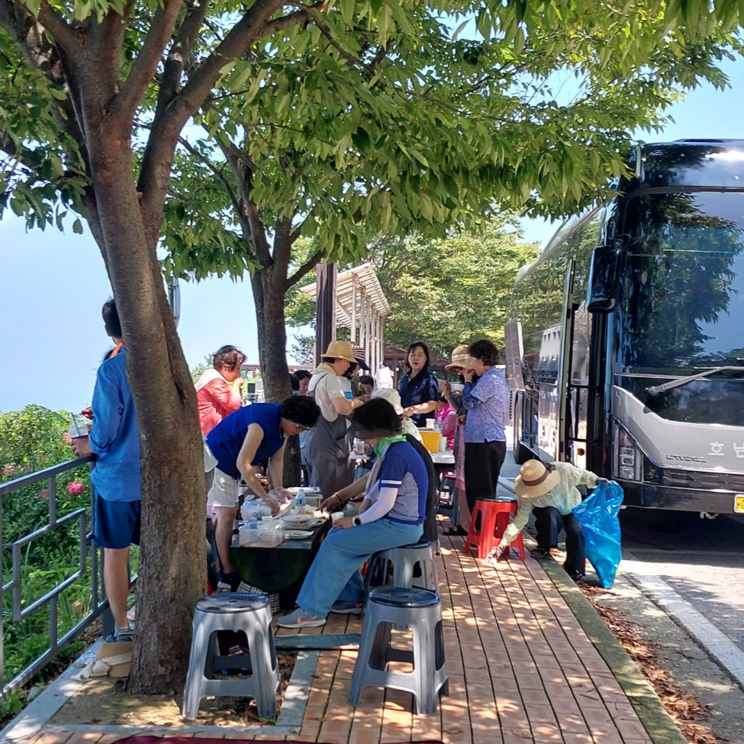 알이 튼실한 옥수수를 쪄온 분, 통닭도 빠지지 않는 간식이다. 과자 간식까지 사람이 움직이면 먹어야 할 것이 많다. 예쁜 체리도 밥 먹은 후 우리 입안을 달달하고 상큼하게 해 준다. 저녁은 맛있는 된장찌개 준비를 해 오셔 우리는 맛있는 저녁을 먹었다. 자기가 맡은 일은 솔선 수범해서 일처리를 하는 분들, 모임의 꽃은 총무님이다. 언제나 느끼는 일이지만 또 한 번 놀랐다. 몸이 좋지 않은데도 일 처리를 한 치의 오차도 없이 처리하는 능력에 놀라고 싫은 내색 한번 하지 않는 모습에 놀랐다. 여행을 주관한 회장님과 총무님에게 박수를 보내고 싶다.