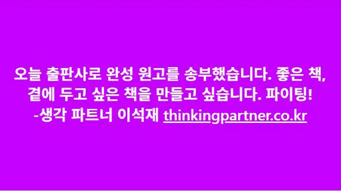 한편 ‘아직 여유가 있지, 좀 더 보시게’라는 내면의 목소리도 있다. 이번 주말까지 보고 다음 주 초에 출판사로 보내자. 기존보다 150% 느리게 가자!
