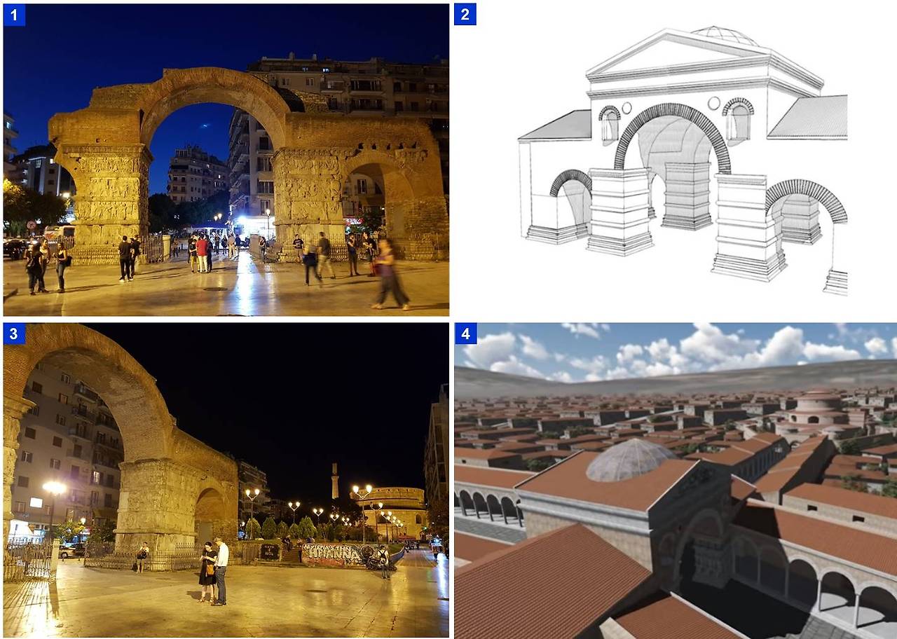 사진 1. 갈레리우스 로마 황제의 개선문과 로툰다 (그리스 테살로니키) (1),(2) 갈레리우스 로마 황제가 부제(카이사르) 시절이었던 서기 298년에 사산조 페르시아 군을 격파한 것을 기념하기 위해 자신의 관할구역인 테살로니키에 세운 것이다. 현재는 개선문의 기둥(4x2=8개) 가운데 서쪽에 있던 기둥 3개만 남아 있다. (3) 개선문에서 바라본 로툰다 (4) 로마제국 시기(CE 4세기 초)에 황제 도시로 번영을 구가했던 테살로니키 모습으로 개선문과 로툰다는 남북대로 상에 놓여 있었다.
