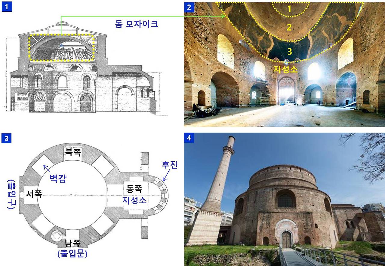 사진 2. 로툰다 (1) 땅바닥에서 돔 꼭대기까지 높이는 30m이고 돔 높이만 10m이다. 돔 위에는 지붕을 씌웠다. (2) 로툰다 내부. 둥실한 천장(돔)을 세 영역으로 나누어 모자이크로 장식했다. (3) 평면도 (4) 출입문이 있는 남쪽에서 바라본 로툰다