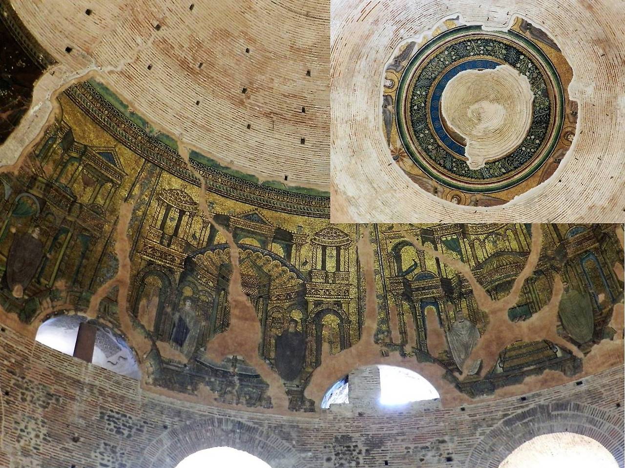 사진 3. 로툰다 돔의 모자이크 비잔티움 예술가가 창안한 돔 모자이크의 주제는 천상의 세계였다. 그는 천장 돔을 삼분할 하고 아래부터 위로 순교자, 천국의 뜨락, 예수 그리스도의 출현(오른쪽 위 사진)을 표현했다.