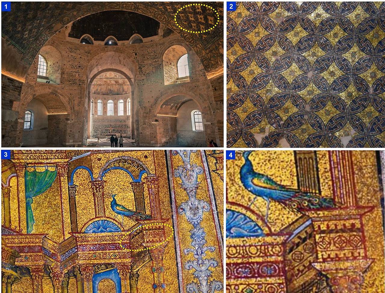 사진 2. 로툰다의 산딸나무 꽃무늬 모자이크 (1)-(2) 서쪽 통로의 둥근 천장을 장식한 모자이크와 노란색 동그라미 부분의 확대 사진 (3)-(4) 중앙 돔 모자이크(순교자 영역)에서 배경 건물의 아키 트레이브를 장식한 모자이크와 노란색 동그라미 부분의 확대 사진