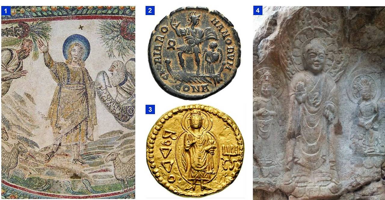 사진 1. 예수 그리스도, 로마 황제, 붓다의 상 비교 공통적으로 ‘두려워 말라’는 손동작을 하고 있다. (1) 예수 그리스도의 모자이크 (4세기 초, 이태리의 산타 코스탄차 성당) (2) 로마제국의 테오도시우스 1세 황제의 모습을 새긴 주화 뒷면 (CE 379-395년) (3) 쿠샨 제국의 카니슈카 대왕의 금화 뒷면. 붓다를 뜻하는 보도(BoΔΔo)라는 글자가 새겨져 있고, 얼굴과 몸에는 동그란 광배가 표현되어 있다. (CE 120년) (4) 서산 용현리 마애불 (7세기, 백제)