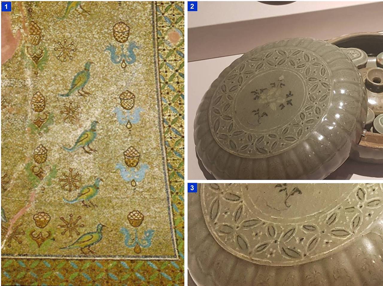 사진 3. 로툰다와 고려청자의 산딸나무 꽃무늬 두 문양은 완전히 닮은꼴이다. (1)남쪽 통로의 둥근 천장을 황실문양(새, 과일, 별)으로 꾸미고 산딸나무 꽃무늬로 테두리를 둘렀다. (2),(3)고려청자 합 뚜껑의 테두리를 산딸나무 꽃무늬로 둘렀다.