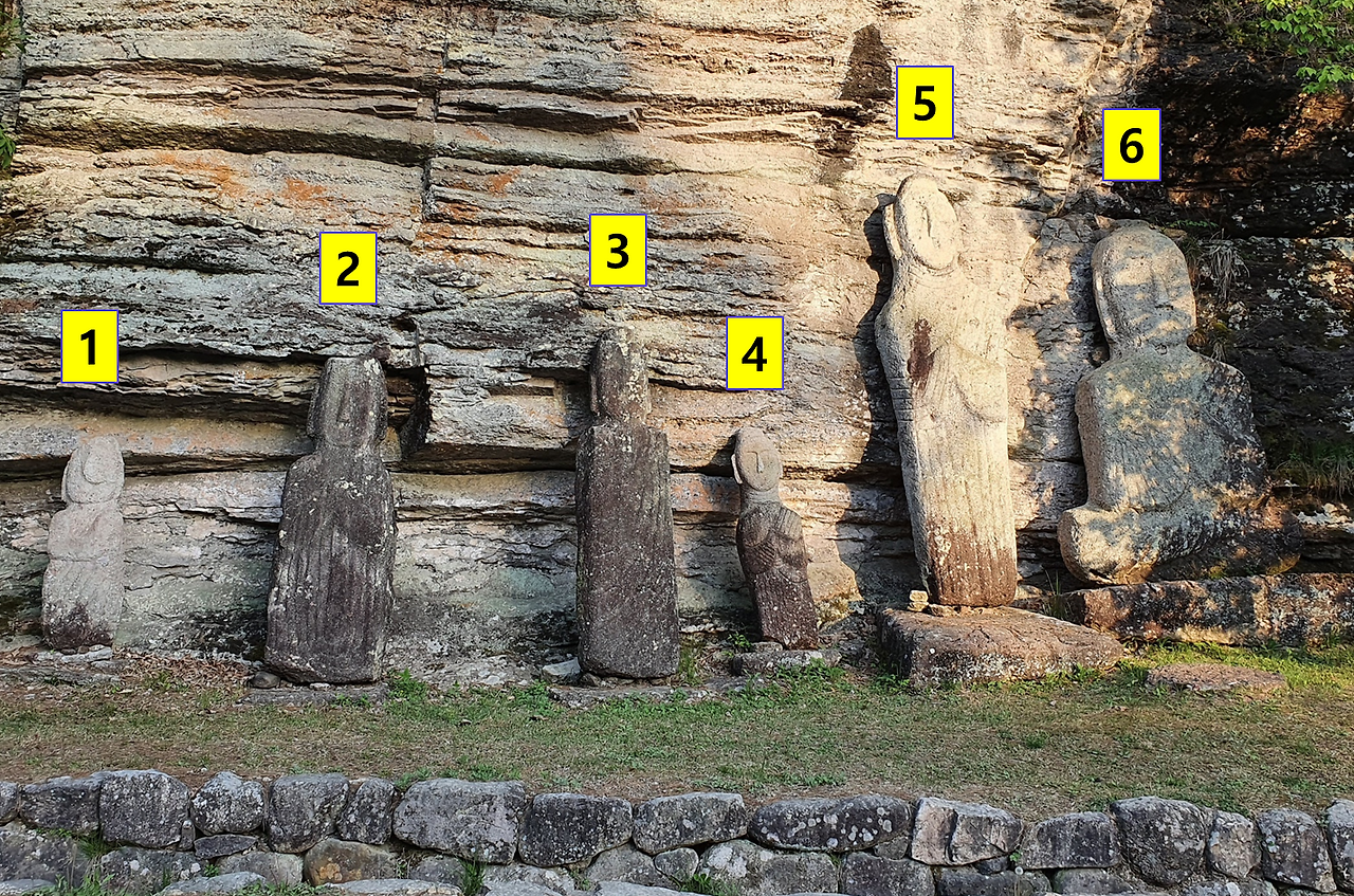 [천불천탑 퀴즈 #2] 석불군(가)로 명명된 위의 석조상 무리에는 불합격품이 섞여 있다. 천불천탑의 조성기간이 매우 짧아서, 전라도와 경상도에서 긁어모은 수천 명의 석공을 가장 먼저 네 개의 정토별로 인원을 배정하고, 각 정토에 세울 불상, 석인상, 석탑, 극락 장엄물 별로 다시 인원을 나누어, 일종의 분업 체재로 천불천탑을 조성했을 것으로 짐작된다. 수천 명의 석공 역시 조각에서 실력 차이가 많이 났고, 일정에 쫓겨 서두르다 보니 가끔 불합격품도 만들어지곤 했다. 이것은 무엇보다 천불천탑의 사상적 배경이자 설계도인 <관경16관변상도>의 도상을 모든 석공이 충분히 이해하고 숙지하지 못한 탓으로 보인다. 어쨌든 위 <사진 1>의 암벽 아래에 세운 비구상 무리(1번~5번)에는 <관경16관변상도>의 도상에는 없는 비구상(즉, 불합격품)이 존재한다. 몇 번일까요? ^^