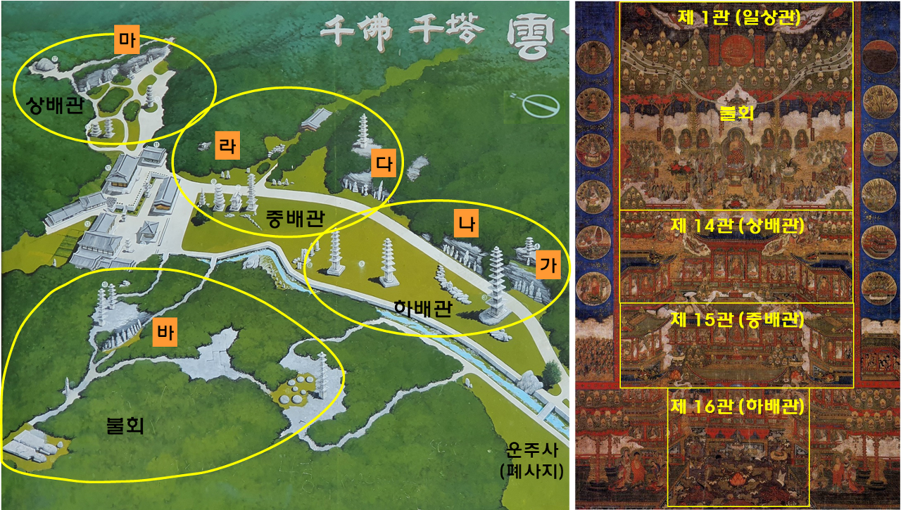 <그림 2> (왼쪽) 천불천탑 공간은 (오른쪽) 고려 <관경16관변상도>의 구성처럼 네 개의 정토(불회, 상배관, 중배관, 하배관)로 구성되어 있다.