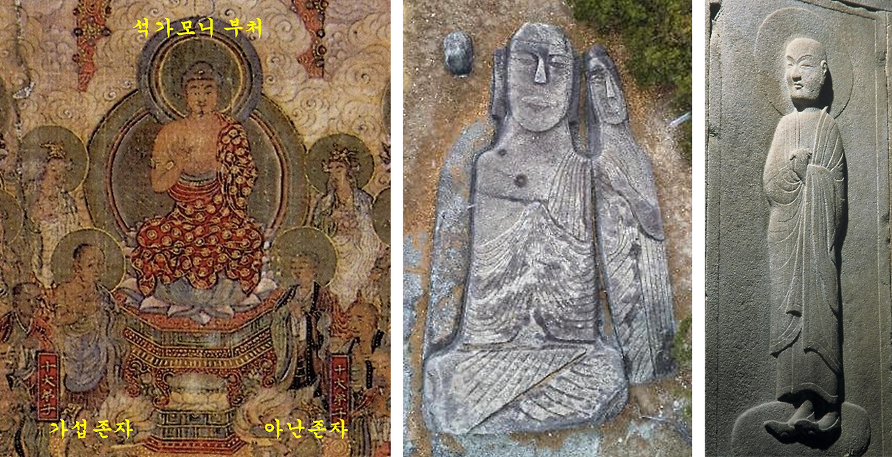 <그림 3> (왼쪽부터) 서복사 소장 <관경변상도>의 불회 장면에서 석가모니 부처와 두 제자(가섭, 아난), 천불천탑의 거대 와불과 입상, 석굴암의 아난존자 부조