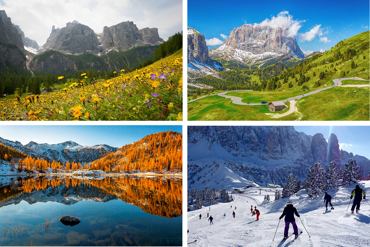 - 돌로미티엔 유럽에서 손꼽히는 스키장이 많으며 (스키의 메카), 고산지대라서 눈이 많이 내려 12월부터 이듬해 4월초까지 스키를 탈 수 있음 (7월에도 그늘진 곳에는 눈이 쌓여 있음)