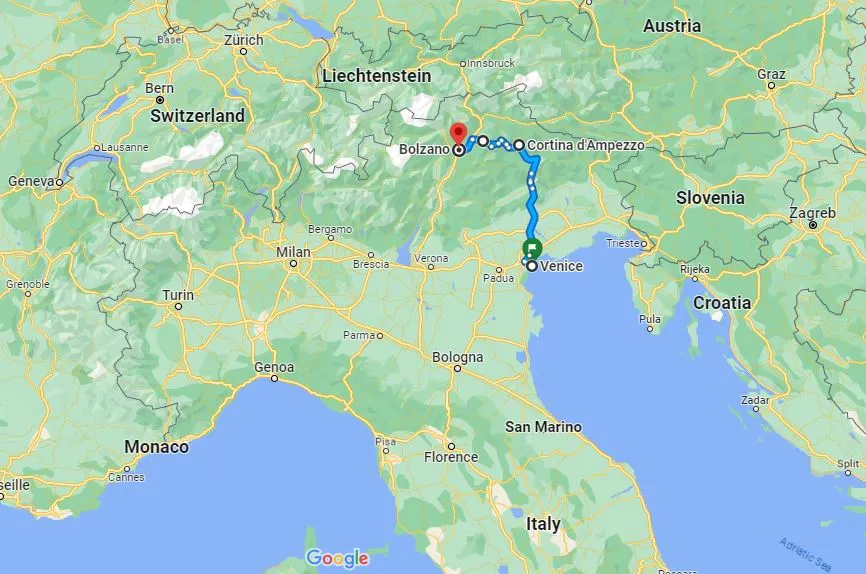 - 베네치아 마르코폴로 공항을 출발하여 (차량은 국내에서 인터넷으로 신청할 때와 다른 체코의 SUV: 스코다(SKODA)가 현지에서 배정됨). 여행 경로는 크게 베네치아 -> 코르티나 담페초(3박) -> 파쏘 가르데나(이동 루트의 큰 고갯길) -> 오르티세이 (3박: 이곳에선 곤돌라 탑승장까지 걸어서 이동했기 때문에 차량은 숙소 주차장에 3박4일간 세워둠) -> 볼짜노-베로나-파두아를 거쳐서 다시 베네치아 공항까지 총 650 km 주행함 => 차량 반납할 때, 휘발유가 1.5눈금 정도 남았고, E5 가솔린 (가솔린 95% + 알코올: 5%)을 꽉 채워 반납했는데 주유비용은 약 45리터 = 12만원 나옴 => 이태리 휘발유 가격이 우리나라보다 비싸다고 함. 나중에 찾아보니, (23년 6월말 기준) 1리터당 1.865 유로(=2650원)였음