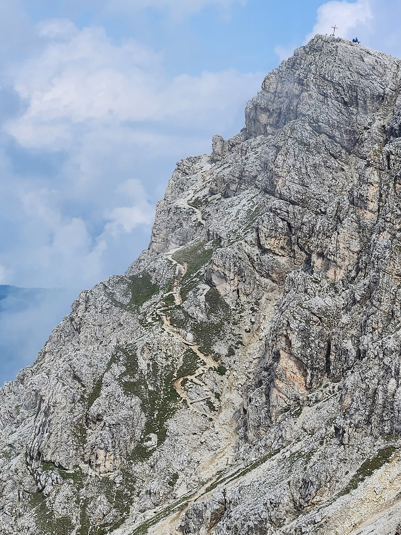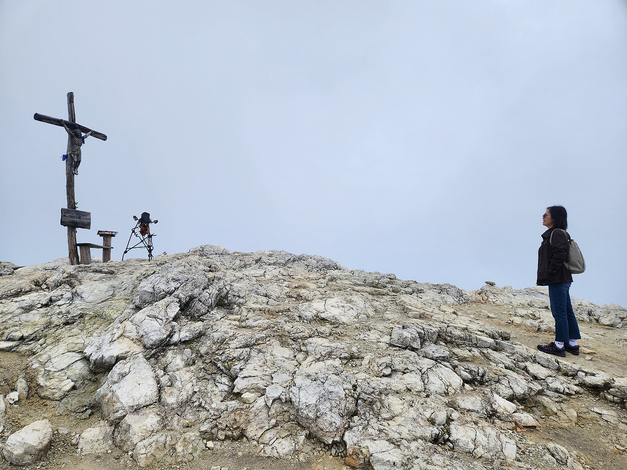 케이블카 승강장에서 탑승권(수퍼썸머 카드)을 구입하고, 케이블카를 타고 산 꼭대기에 있는 정거장에서 내리니, 산 오른쪽에는 마치 병풍이라도 둘러친 듯 거대한 암괴가 시야에 들어온다. 와~ 정말 가슴이 웅장해지는 풍경이다. 케이블카 탑승장 바로 위에는 라가주오이 산장(Lagazuoi Refuge: 2,752 m)이 보인다. 돌로미티 알프스 산맥의 모습을 날 것으로 보여주는 장쾌한 풍경을 잠시 구경하다 위쪽으로 난 길을 따라서 산책하듯 걸어 올라가니 십자가가 세워진 라가주오이 정상(2,778 m)에 도착하였다.
