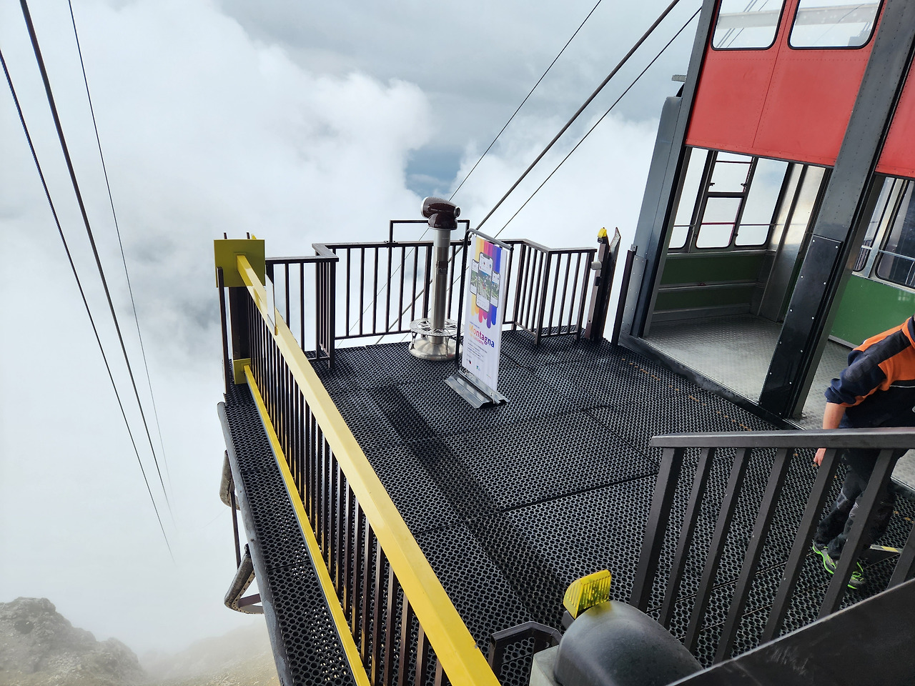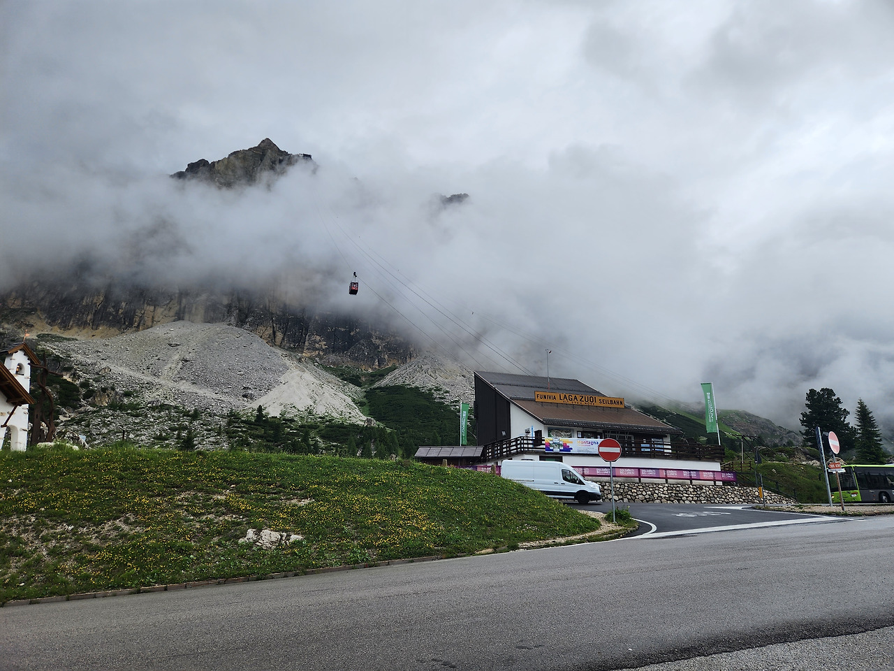 라가주오이 산의 높이는 백두산보다 살짝 높은 2,778 m이다, 파쏘 팔자레고의 높이는 2,105 m이니까 약 600 m 를 케이블카를 타고 올라갈 수 있다. 이른 아침에 고갯길에 도착하니 짙은 운무가 산허리를 감싸고 있었고 운무를 뚫고 케이블카가 운행되었다. 7월초 돌로미티 날씨는 밤새 비가 내리고, 아침-오전-이른 오후까지는 쨍하니 햇빛이 들다가, 늦은 오후부터 다시 구름이 몰려오면서 소나기가 쏟아지곤 하였다.
