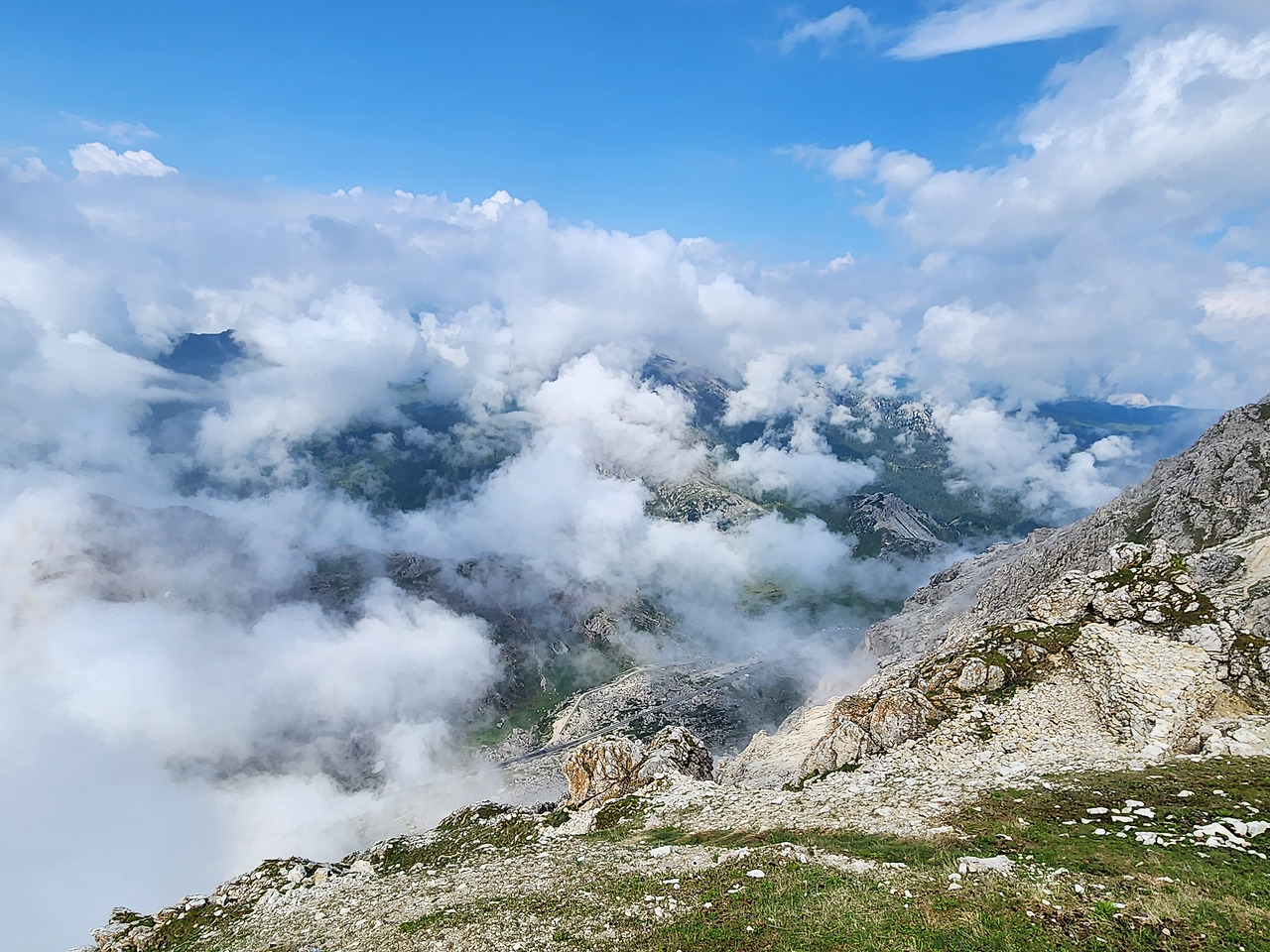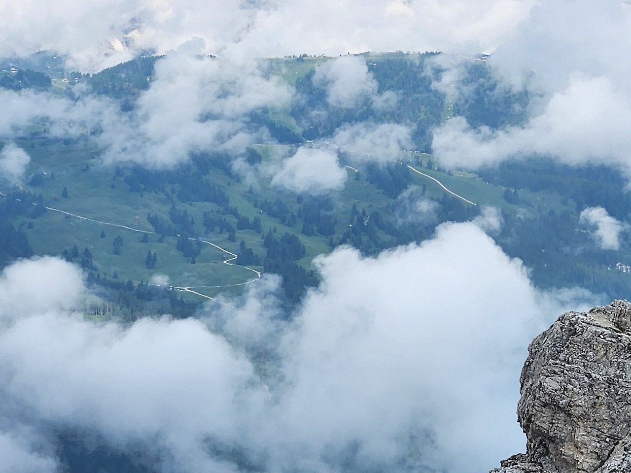 사진 14. 라가주오이 산 정상에서 내려다 본 풍경. 구름 아래 가늘게 이어진 길은 코르티나 담페초(동쪽)에서 오르티세이(서쪽)로 갈 때 달리는 길이다.