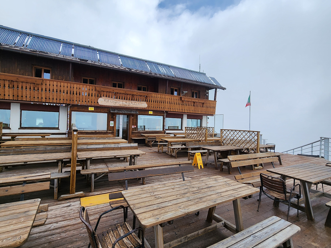 2,752m 고도에 위치한 라가주오이 산장은 코르티나 담페초 지역에서 가장 높은 위치에 있는 산장으로 돌로미티에서 가장 탁 트인 전망을 자랑한다. 여기서 에스프레소를 한잔 하면서 운무에 감싸인 돌로미티 알프스 풍경을 감상하였다.