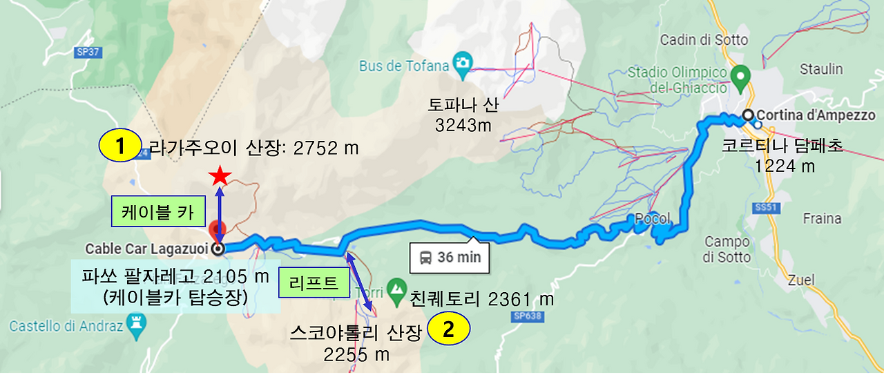 돌로미티 여행 이틀째인 7월3일(월)에는 라가주오이 산과 친퀘토리 일대를 하이킹할 계획이다. 코르티나 담페초 마을을 출발하여 구불구불한 산길을 약 30분간 오르면 '파쏘 팔자레고(Passo Falzarego)'로 불리는 하늘재(해발고도: 2,105m)에 도착하는데 여기에 케이블카 탑승장이 있다. 아침 8시 조금 너머 숙소를 출발했더니 고갯길의 무료 주차장에는 차를 세울 공간이 충분했다. 주차장에는 네 명의 암벽 등반가가 차에서 암벽 등반장비를 꺼내 땅바닥에 펼쳐 놓고는 장비점검을 하고 있었다.