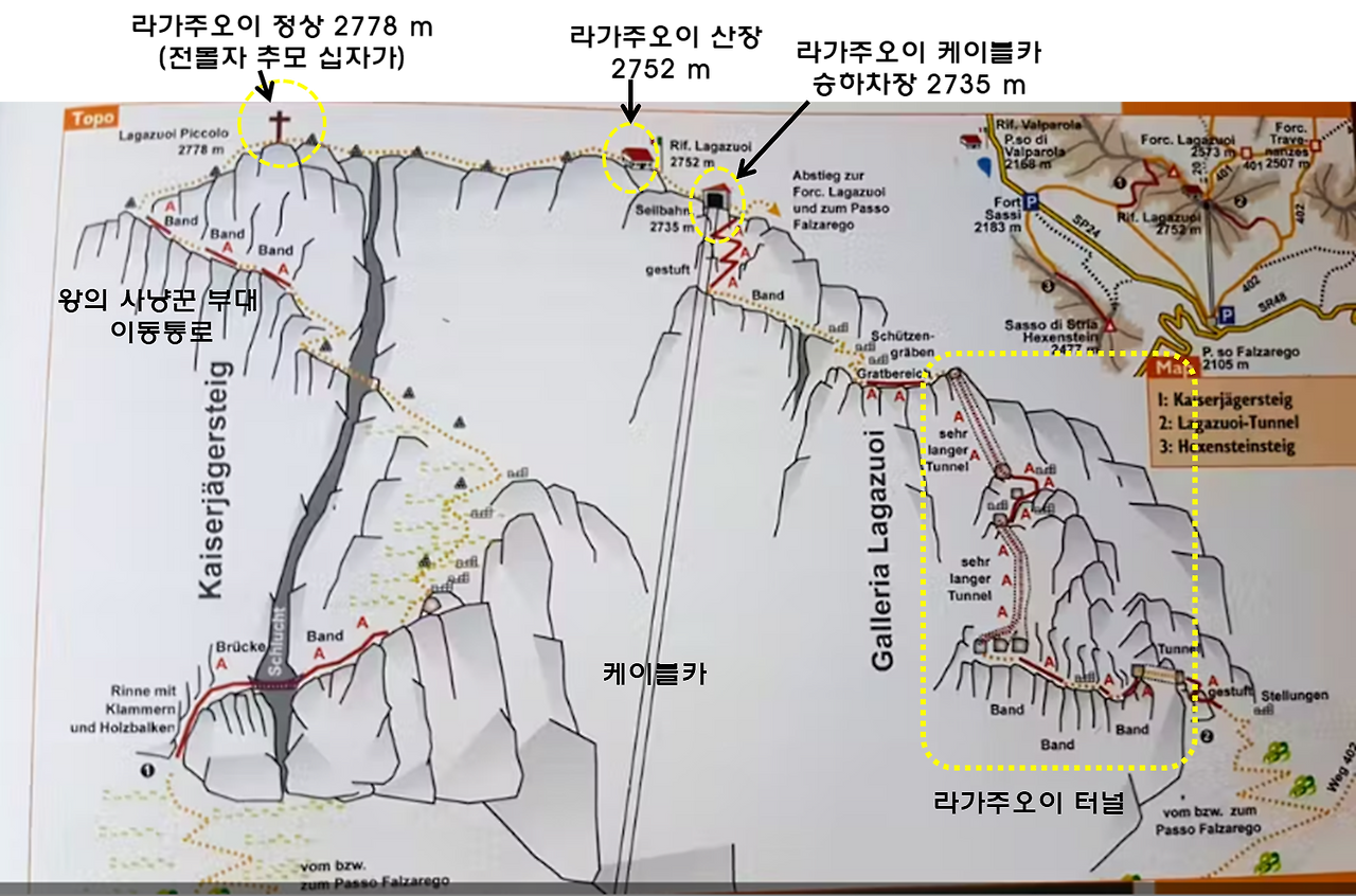 사진 2. 라가주오이 지형도: 왼쪽의 Kaiserjäger(왕의 사냥꾼 부대) 등산로는 오스트리아군의 병참로였고, 오른쪽의 라가주오이 터널(1 km)은 이태리군이 판 것이다.