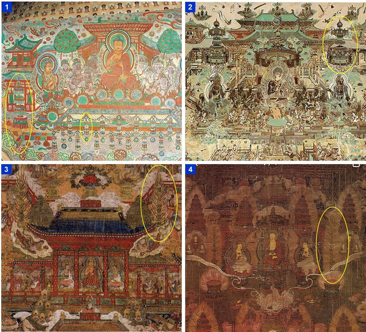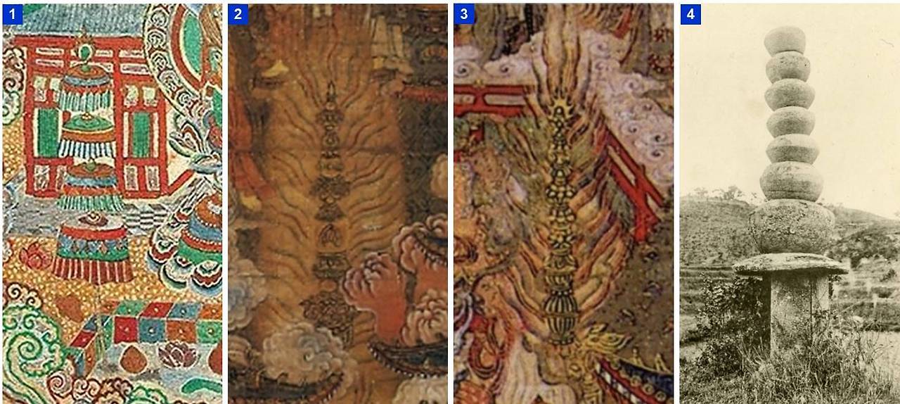 사진 11. (1) 아미타경변상도(둔황 제225굴), (2)&(3) 고려 <관경16관변상도>의 보주당, (4) 천불천탑의 원형다층석탑은 보주당을 석탑양식으로 만들어 세운 것이다.